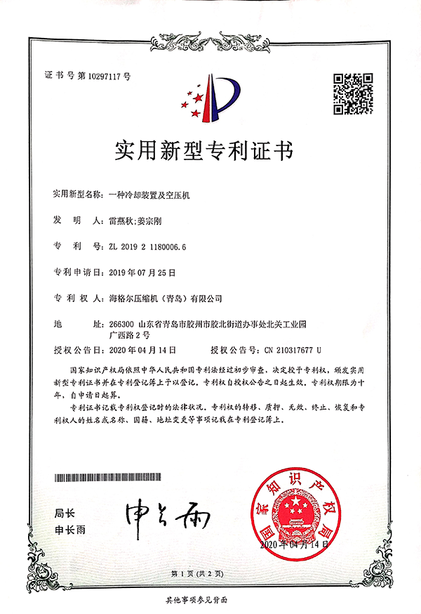 近日,技術部再傳喜訊,海格爾壓縮機榮獲了三項專利,分別是:
