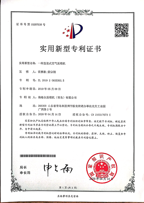 祝賀海格爾壓縮機(青島)有限公司再獲三項專